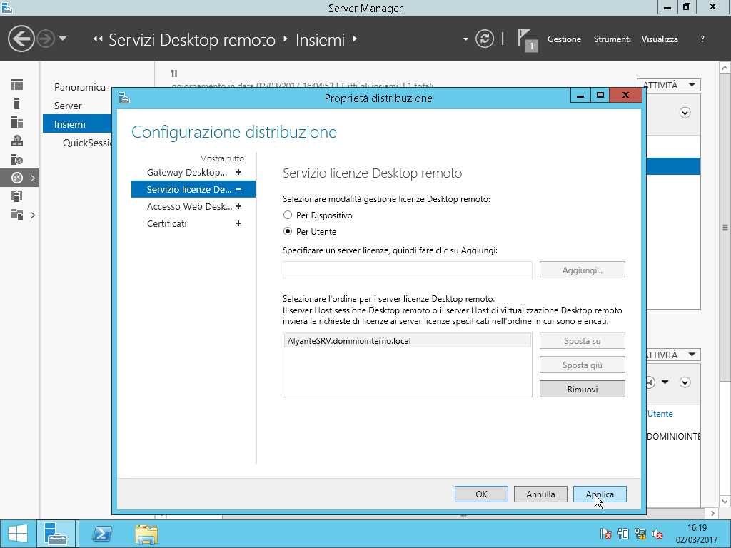 Impostare il Servizio licenze Desktop remoto “Per Utente” ed applicare: