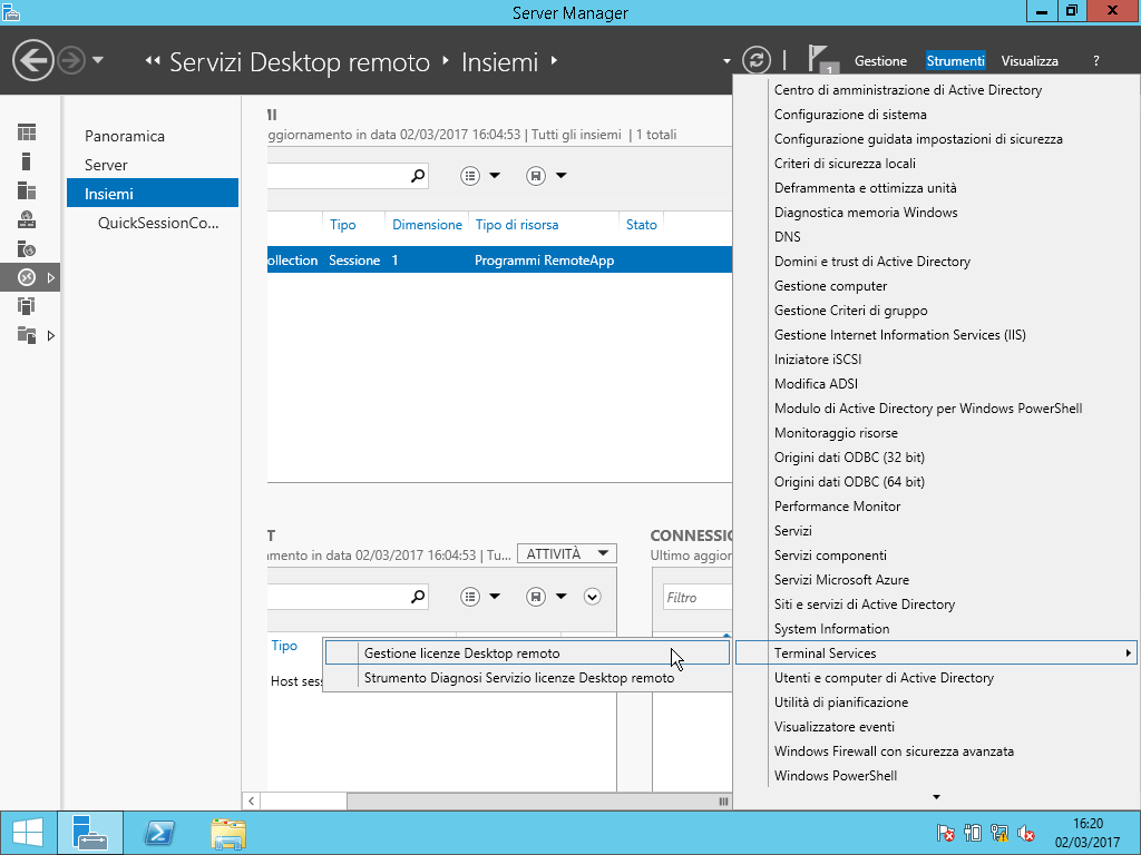 Avviare la “Gestione licenze Desktop remoto” ed abilitare il server ed installate le licenze: