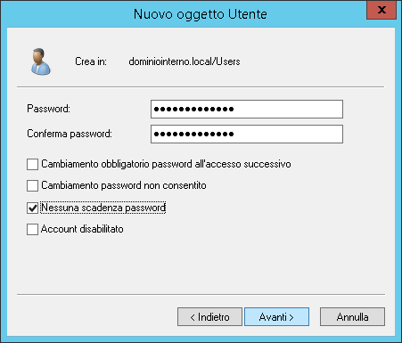 Impostare gli utenti con nessuna scadenza password e rimuovere flag “Cambiamento password all’accesso successivo”.