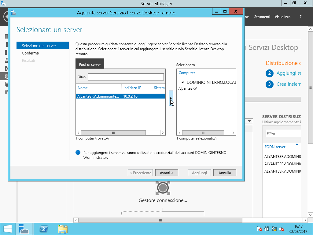 Selezionare “Servizio licenze Desktop remoto” ed aggiungere il server: