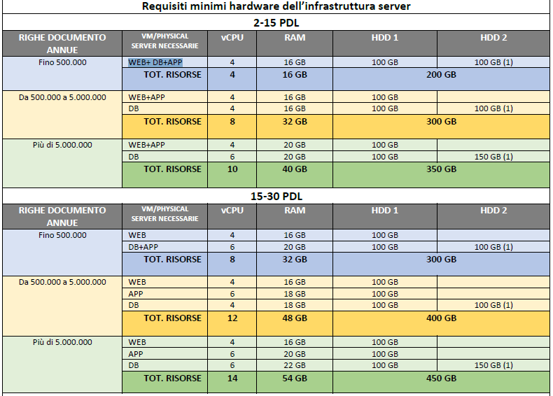 In base al numero utenti/righe documento annue l’architettura potrà essere “scalata” in base a quanto indicato nei seguenti parametri: