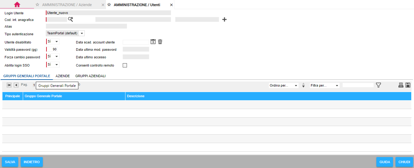Si passa quindi alla creazione delle Azienda con i rispettivi gruppi aziendali, alla creazione degli eventuali gruppi generali portale e quindi si procede con le associazioni desiderate.