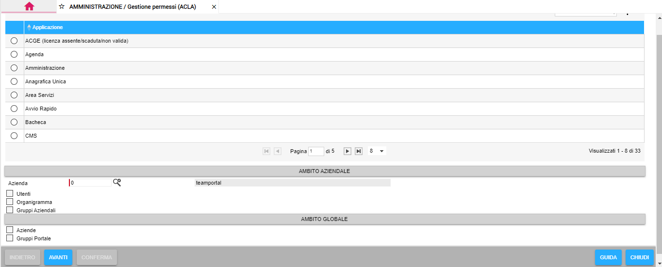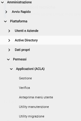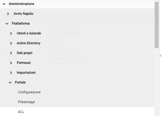 N.B.! una volta abilitati i permessi ACL, se non vengono gestiti, gli utenti non avranno visibilità dei punti di menù delle Applicazioni del portale, di conseguenza vanno contestualmente gestiti nel momento dell’attivazione.