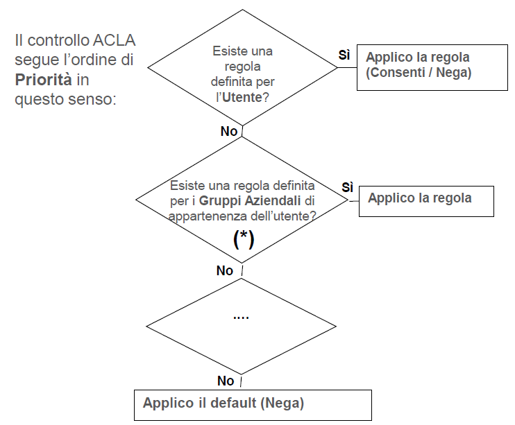 Inoltre se nell’ambito dello stesso “criterio di raggruppamento” (es.: Azienda), l’utente appartiene a più gruppi azienda, ed esiste una regola “Consenti” per almeno uno dei gruppi a cui l’utente appartiene, anche in presenta di una regola “Nega” su un altro/i gruppo/i, il permesso viene consentito.