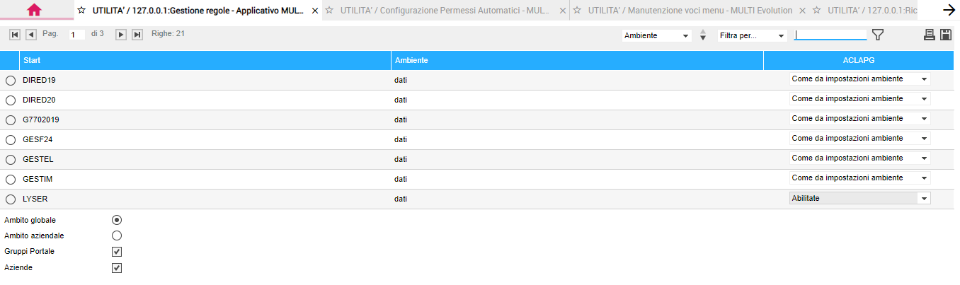 Tramite la funzionalità Utility di manutenzione di Amministrazione / Permessi / Applicazioni (ACLA) è possibile gestire immediatamente tutte le regole ACLA definite sull’applicazione selezionata, con la possibilità di modificare o rimuovere rapidamente le regole selezionate.