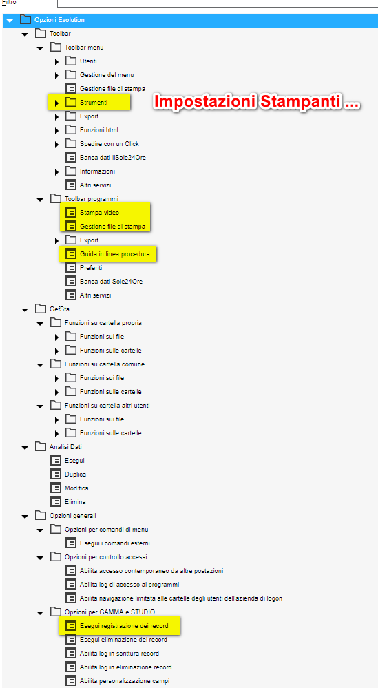 La prima sezione consente di abilitare/disabilitare le voci presenti nel menù di procedura, mentre la seconda sezione “Toolbar, GefSta, Opzioni Generali” consente di abilitare/disabilitare i pulsanti della barra degli strumenti di Evolution, nonché le specifiche funzioni ad essi associate, ed è comune a più applicativi dell’ambiente. Sono poi presenti voci specifiche per ciascuna procedura gestionale.