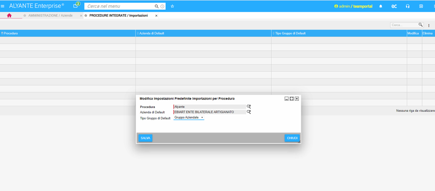1. entrare in Polyedro con utente admin, andare in ‘Amministrazione\Piattaforma\Portale\Procedure’ ed eliminare la procedura di Alyante (se presente);